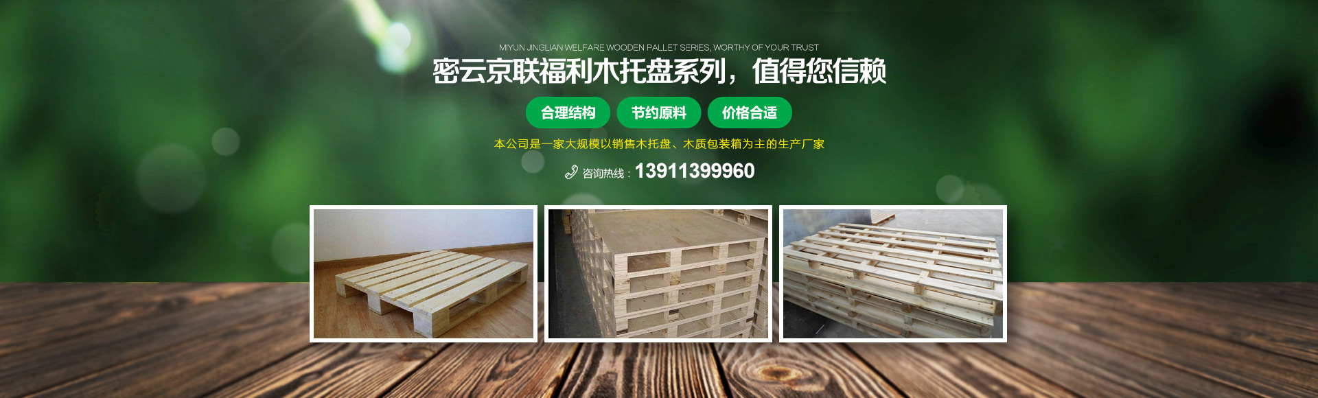 北京京聯國順木制品有限公司 (原北京市密云縣京聯福利木制品廠)成立于1993年,位于北京市密云縣西田各莊鎮蒼頭村,占地約5000平米。我公司工廠是一家大規模以銷售木托盤為主的生產廠家。本工廠是一家直接采購原木,按客戶要求生產規格尺寸的托盤,我公司工廠位于河北省承德市有著木材加工點,可以做到,從山上的木頭下山到客戶手中的托盤都是一手貨,減少了中間商的費用,所以我公司售出的產品對北京這個龐大的市場來說在同樣的規格尺寸的托盤來說價格比較占優勢。